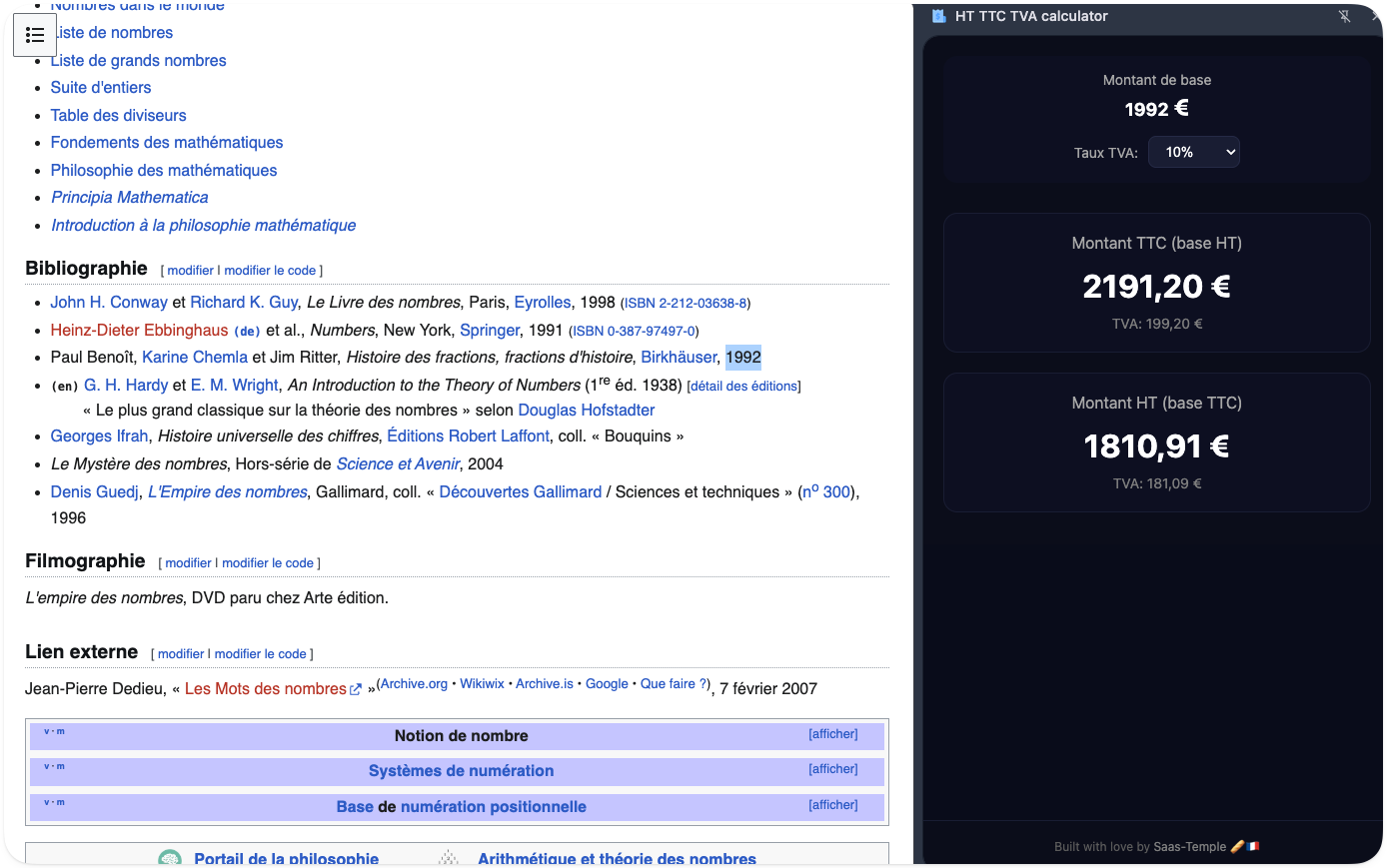 Plugin Chrome qui converti chaque nombre sélectionné à la souris en HT ou TTC